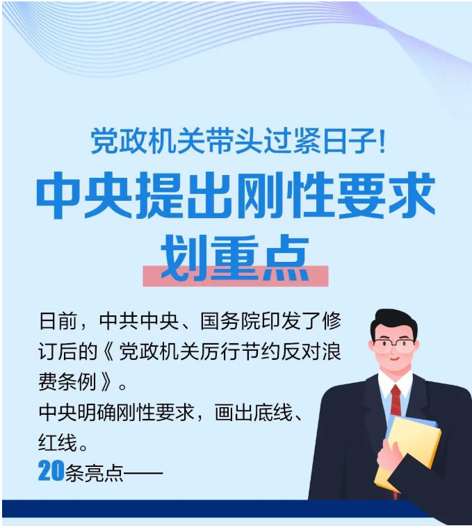 【普法小助手】党政机关厉行节约反对浪费条例日前中共中央、国务院印发了修订后的《党政机关厉行节约反对浪费条例》中央明确刚性要求画出底线、红线